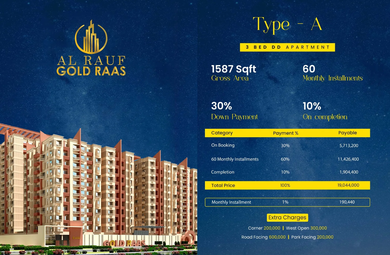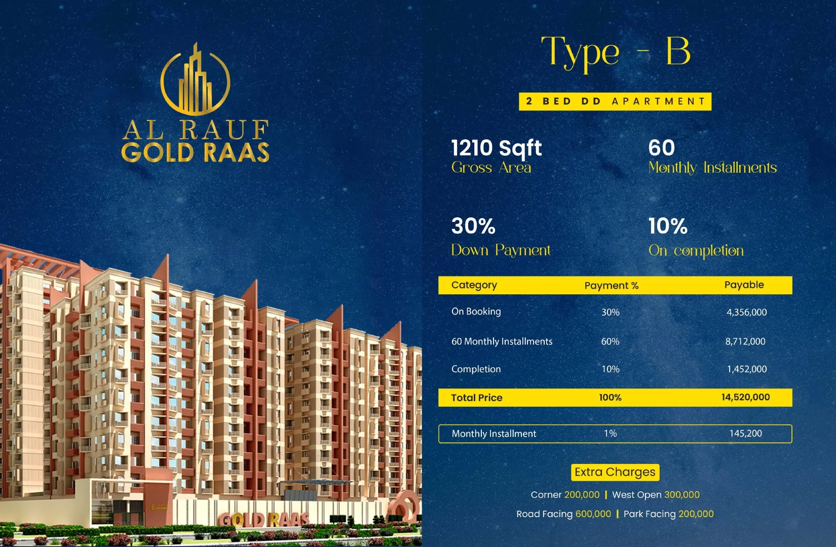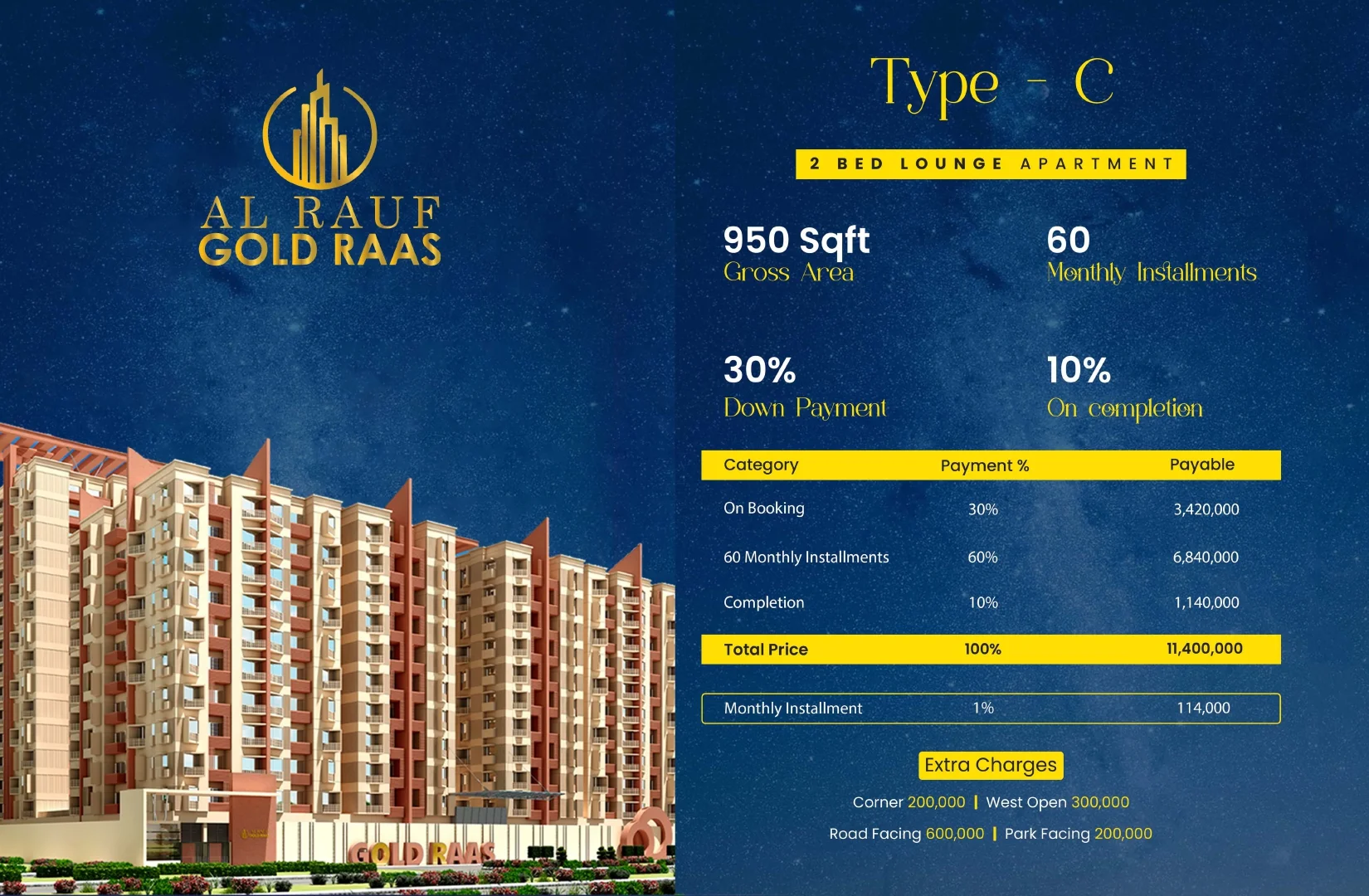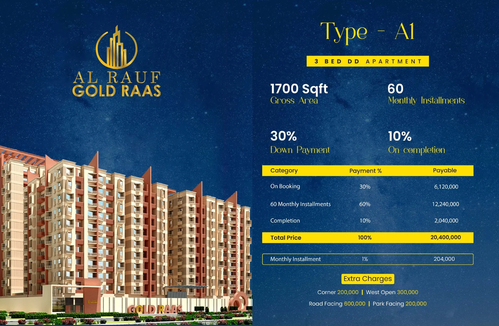 At Al Rauf Gold Raas, every detail is designed to elevate everyday living. The project features spacious and intelligently designed luxury apartments in the following configurations: